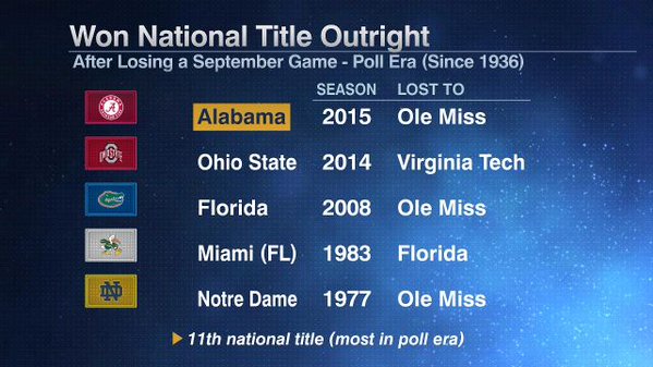 To be fair, given that the Badgers lost 35-17 (making it a decent game) and scoring points against Bama, Bama deserves this title. They beat the top defense in the country to start the season, Clemson is falling apart, ACC once again the goat.