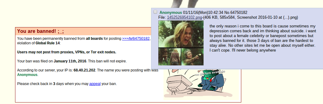 they really don't like trolling either. 4chan is basically reddit now. don't let anyone tell you different. ever since gamergate and the fappening they basically ban for anything now.