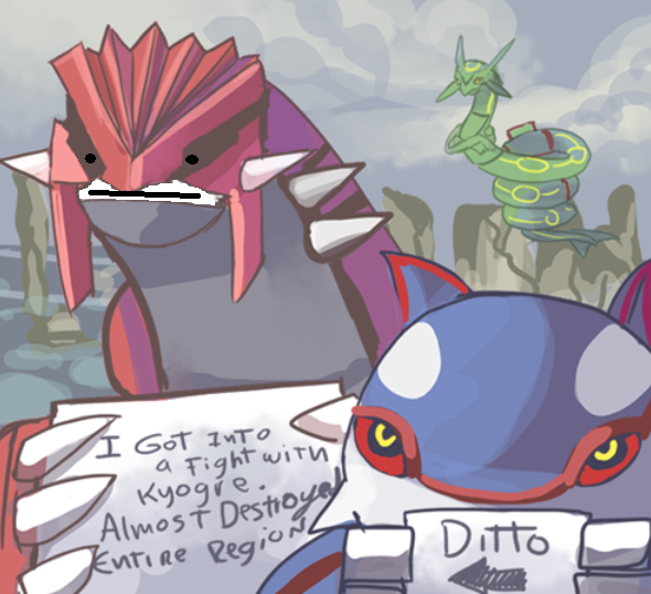 | Groudon: "I got into a fight with Kiogre and almost destroyed an entire region." Kiogre: "Ditto." Kiogre got into a fight...with himself. | ||