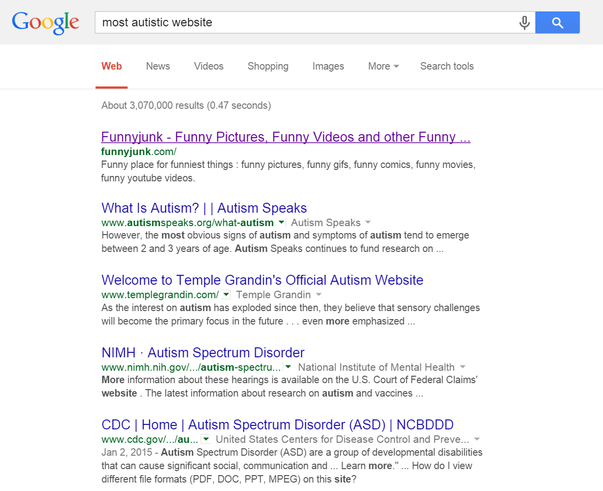 | Well, if you search for it as a phrase, it does work like that. www.google.com/search?q=most+autistic+website&ie=utf-8&oe=utf-8#q=%22most+autistic+website%22 #97 -