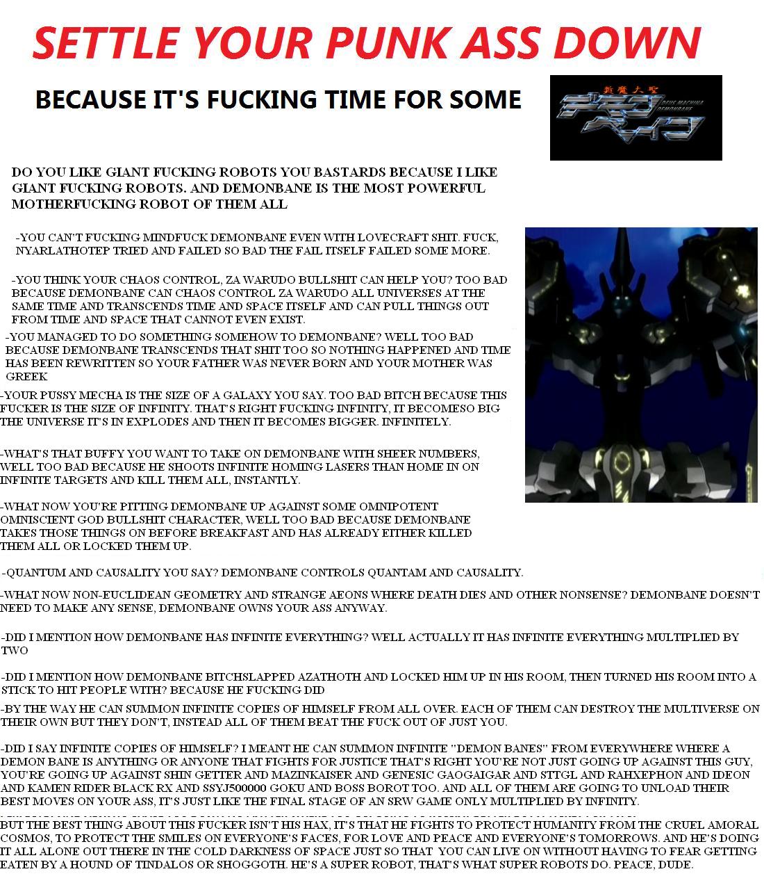 asasqw (12/28/2015) [-] To give a short list here Has an old god imprisoned in its weapon which it put there Full 4th denominational travel so can go both forwards and backwards in time at will Zero point energy manipulation think of it like the force of a big bag condensed down to the size of a laser pointer, pointed at you And the thing that makes it the single most OP creature in fiction: It can summon any and all versions of itself thought out the multiverse instantaneously but , Super Tengen Toppa Gurren Lagann (the thing that looks like Kamina and is made of galaxies) ends up being Literally universe sized, it was effectively, a Universe in and of itself. A universe that perpetuates itself via willpower , that also generates life, life can generate infinite will power, making the universe it exist in , grow infinitely fast , to an infinite size , in an infinite amount of time. Super Tengen Toppa Gurren Lagann , is infinitely growing infinity , making it infinitely bigger than infinity. So, technically , it's on Par to that thing you just posted (since even infinite infinites aren't actually more than infinity) Even so growth in that form takes time, it is exponential and gets to a point that is practically imminent. With DemonBane's power over time it can summon as many that are needed to overpower STTGL Super Tengen Toppa Gurren Lagann even before the fight starts. Though STTGL should have some degree of influence over time anything with that much mass needs to generate a gravity field at least on par with a black hole but it wouldn't be consistent throughout STTGL. Regardless they don't mention any alteration to the flow of time but Jesus fuck is that thing fast that a human can watch it fight in real time from earth and them still moving as fast as us but if you want to get into reality shattering powers, the probability altering missiles are mind boggling. So youre telling me there isnt a robot literally made out of galaxies? It would have to be given that its larger than galaxies. Watch the video in comment number 20. No, it wouldn't have to be, you haven't even watched the show and you're trying to explain how things work in it. Spiral Energy, the same thing that's been fueling the mechs in the show since episode 1. Where does the energy come from? Unless its from an alternate dimension or some such, gathering enough energy to make a mech that dwarfs entire galaxies, would destroy countless suns, planets etc. It's something that everyone has, they were exposed to a massive amount of it before that fight, and they're in a universe where thought is given form. Exactly, its fucking stupid. I could probably enjoy the first bit, but knowing whats coming id rather not, since I wanna be able to watch a whole show when I start on it. #33 -
