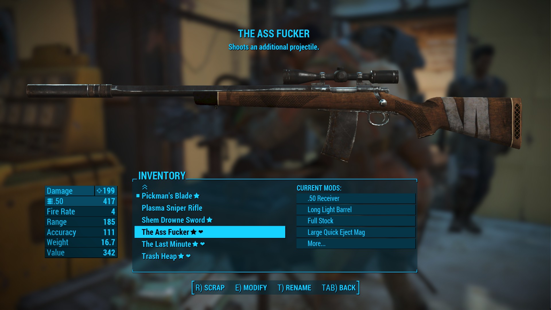 awesomerme (11/20/2015) [-] Its calling it psychobuff because its a combination of psycho and buffout. you can now combine chems at chemistry stations for extra effects Yeah, but Psycho + Buffout can also be called Psychout, which sounds alot smoother, and not as forced as just putting the starting letters of each word togeather. Get X-Cell, my nigga. +2 for every S.P.E.C.I.A.L. for a short amount of time. Yeah X-Cell is good and ill use it whenever i get into a huge jam, but Psychout lasts 8 minutes, so you only have to pop 1 per fight, it also stacks with Bufftats that also last 8 minutes. I got a shotty called the "Le Munitione Terribles" Thats what it was called when I found it , does +25% damage, 50% chance of knockdown and increased recoil. Blows most stuff to shit in one hit, usually puts anything that lives flat on it's ass, only tradeoff is even with all the upgrades, it has absurd recoil. Also found a battle rifle called overseer's guardian, fires 2 shots for 1, fully upgrades can easily headshot a deathclaw in one hit. Suffice to say if I could think of something good to name it i'd probably rename it I think The Extreme Makeover works best for a shotgun. Or "The Plastic Surgeon". Yeah, the Plastic Surgeon. Silly man, there are no more ghettos in the post-apocalypse. Why, the whole world's a ghetto now, my boy! I have a combat shotgun were every shell has a 20% chance to cripple both legs. Whenever a deathclaw charges me it gets crippled and just lays on the ground helpless. I named it "The Shit Sandwhich" cause you know, whenever somebody trips you say that they "ate shit" and the shotgun makes everybody eat shit MY first Gauss Rifle was a Legendary that did 50% extra damage to humans. Felt only fitting to name it the "Genocidal Gauss Rifle" I don't have humorous names for my guns, I just try and go with stuff that sounds cool. The Blowball(Broadsider) The Boss(Assault Rifle) The Close Call(Combat Shotgun) The Custer(Revolutionary Sword) The Dis-Array(Lorenzo's Artifact Gun) The Ice-Breaker(Sledgehammer) The Law(Legendary Laser Rifle) The Lucky Punk(.44 Pistol) The Long-Distance Dedication(.50 Sniper Rifle) The Negotiating Tool(Combat Rifle) The Samaritan(Laser Musket) The Soft Whisper(Deliverer) And the Spinnaker(Minigun) I need to get better at this naming thing. And yeah, I named all my weapons, pls don't judge. M6D (10mm) Dirty .44 (.44 pistol) The Butterfly (.50 sniper) The Quiet Butterfly (suppressed sniper) not really worth it since they still basically see you anyway Mr.Nasty (baseball bat) i don't have as many weapons as you to carry all the names since i really only switch between what i use commonly. and i only name legendaries. my 10mm has the 25% less AP so i can fire a lot and switch to my .44 to refill my AP bar when i use it for crits. my bat is the jamaica treasure bat that i just finished maxing out. #74 -