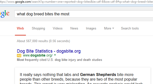 lean (04/06/2015) [-] Aggressive =/= attacking people. Citation needed: am I the only mother fucker with google? You can get to just about any info you need on the subject here: dogbitelaw.com/dog-bite-statistics/all-dog-bite-statistics PIts get the rap because although not noticeably more likely to bite than other breeds, when they do bite their powerful jaws and protective nature often coincide with more severe wounds. Man, that article is a dry read, but I did get to the part labelled "The deadliest dogs". "The Clifton study show the number of serious canine-inflicted injuries by breed. The author's observations about the breeds and generally how to deal with the dangerous dog problem are enlightening. According to the Clifton study, pit bulls, Rottweilers, Presa Canarios and their mixes are responsible for 74% of attacks that were included in the study, 68% of the attacks upon children, 82% of the attacks upon adults, 65% of the deaths, and 68% of the maimings." You may be the only mother fucker with google who chooses not to use it, and places blind faith in that the results will support him. Pitbulls get the bad rap because they attack people often and viciously compared to other breeds. It's both common knowledge and scientifically supported knowledge. www.dogsbite.org/dog-bite-statistics-quick-statistics.php Man, look at all these studies, and basic observation of events. I quote that 3 particular dog breeds are responsible for 74% of attacks, how does that translate to: "Going by your logic, just don't get a dog because they all might bite."? Take a look at what I have, and present how you've seen it "always" shown to be the opposite, show me your source. What a stupid rebuttal, and you know it too, going anonymous. The emotionally invested crowd is on your side anyways, feel free to log in and be wrong. What you are doing is called cherrypicking- that 74% figure involves fatal bites. I said exactly that in comment #8. Pit bulls were bred for fighting, AKA killing other dogs. That being said, pitbulls that were aggressive or violent towards people were killed by fight dog breeders. Look up pitbull bloodlines like Gottiline. You can actually get the history of the breed and characteristics looked for in an ideal pitbull. #20 -
