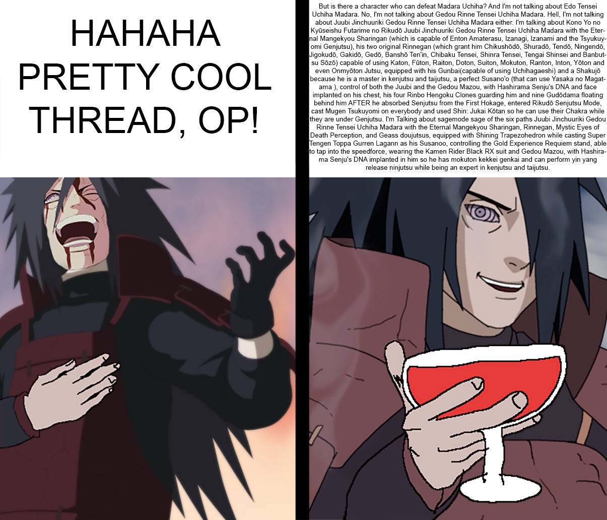 rousingloki (6 hours ago) [-] I guess I'd have to say yes to the FJ Sasuke, the one who would just post how sasuke sama is basically a god and would do something awesome or better than OP | ||