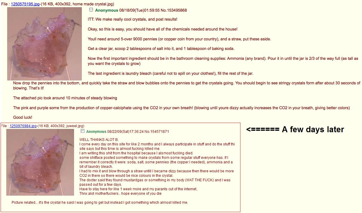 | Posts like that are a test. Anyone willing to trust advice from /b/ that involves bleach is a danger both to themselves and others. Getting your shit together and doing something with your life. plz advice | ||