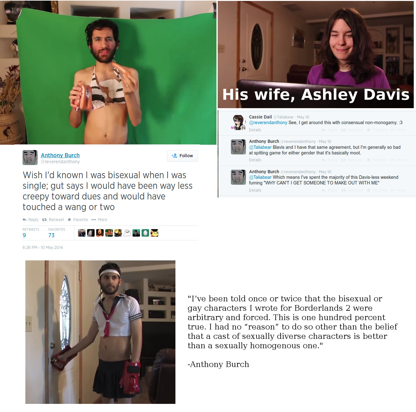 | He's bisexual, in an open relationship, and writes gay/bisexual characters for no other reason than to spice things up. Nothing about that screams "SJW." There's generally never a "reason" to make a character gay unless you're writing about the struggles of gay people. There's, after all, no "reason" for people to be gay in real life. They simply are. idk man, to me its just looking like hes saying he's into guys to be a good progressive, and part of the cuck thing is all the other evidence that the open relationship stuff was pushed by his wife He's a goober, and he may have dun goofed up his marriage, but agreeing that some guys do some shitty, overly aggressive things to women when flirting hardly makes one an SJW. but its less about the instance of flirting and more of the "fucking hate men" statement and sympathy that pushes his more towards the socjus side. Im not the most well versed in this specific argument and theres alot more "proof" if you wanna call it that. Just google shit my nigga | ||