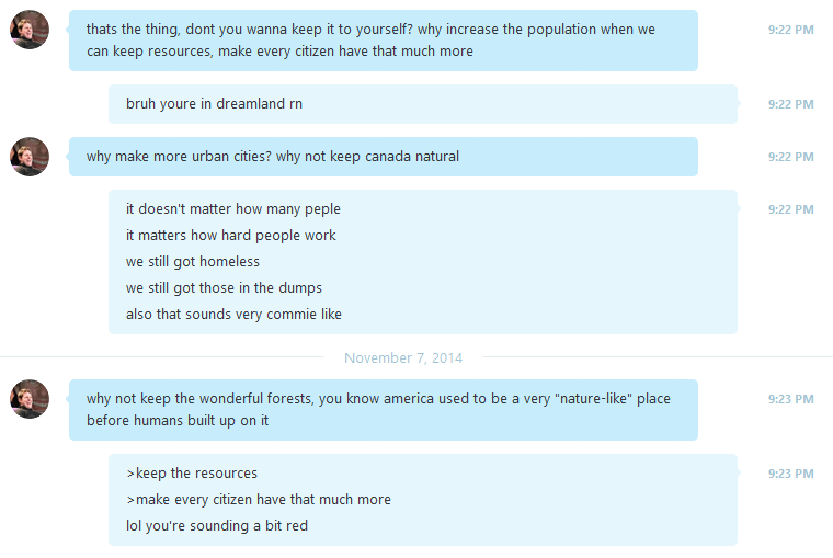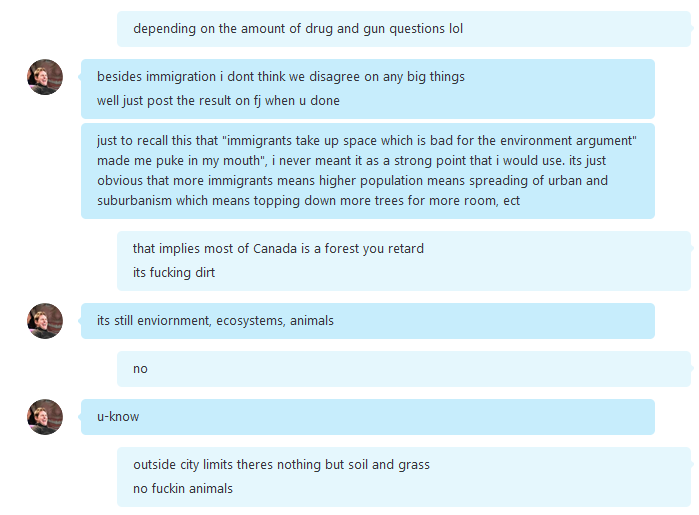 | Damn man, I would never think you'd go this far. Taking screen caps of month old conversations? I wonder if you did this during the time or you had to scroll up and find this. Either way it's simply pretty pathetic, I thought you had some principle. It's not that I have written you anything private but just the fact that you'd go behind my back like that makes me really happy I don't. And simply put you cherrypicked and took one part of the conversation which I mentioned wasn't even a major argument but just for something libs should think about increased population = more land wasted, it's simple. Not a major argument but just a funny thought for all the tree huggers Also a douchebag move. | ||
