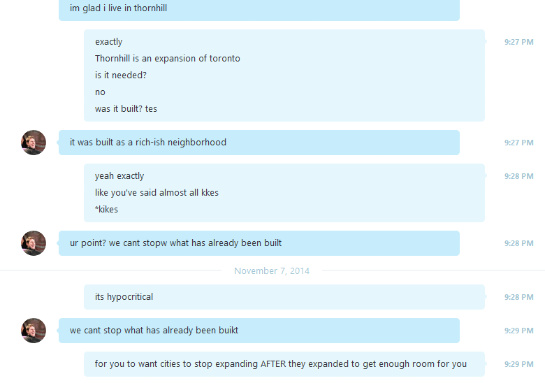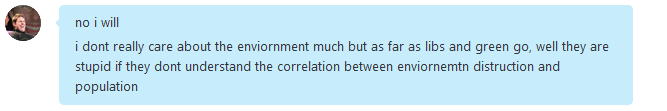 | Political correctness is far from tumblr, it's a major part of the leftist movement. Literally no. The State of the Union address is Tuesday. Just listen for Obama to say anything related to that. What 95% of the liberals in this country want is marriage equality in all states, progress to the global warming problem, a better distribution of wealth among citizens, and racial equality. I know that people who want to regulate everything so they aren't offended are usually liberals but that's like saying people who want to bring slavery back are usually conservatives. It doesn't represent the side's agenda. Damn man, I would never think you'd go this far. Taking screen caps of month old conversations? I wonder if you did this during the time or you had to scroll up and find this. Either way it's simply pretty pathetic, I thought you had some principle. It's not that I have written you anything private but just the fact that you'd go behind my back like that makes me really happy I don't. And simply put you cherrypicked and took one part of the conversation which I mentioned wasn't even a major argument but just for something libs should think about increased population = more land wasted, it's simple. Not a major argument but just a funny thought for all the tree huggers Also a douchebag move. | ||