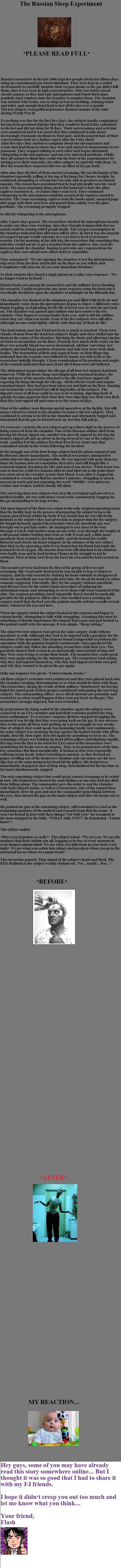 Russian Sleep ExperimentflashcacheBlocksBlocks prevnext Prev Next prevnextHey guys, some of _ may have already read this story somewhere online... But I thought it was , good that I had to share it ith my friends. I hope it didn' t creep you out too much and let me know what you think...... +2054 -Favorite +Favorite Unblock User's Content Block User's Content